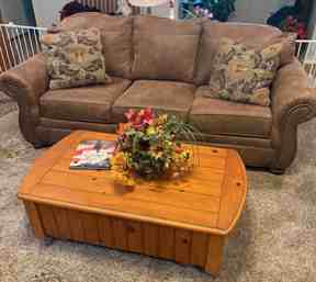 Sofa $225. & Recliner, 2-drawer Coffee Table, 59”x43” dark-wood Dining Table 59x43 w/leaf, 6 chairs $300./all (in Huntington) (cell) 559.375-5027